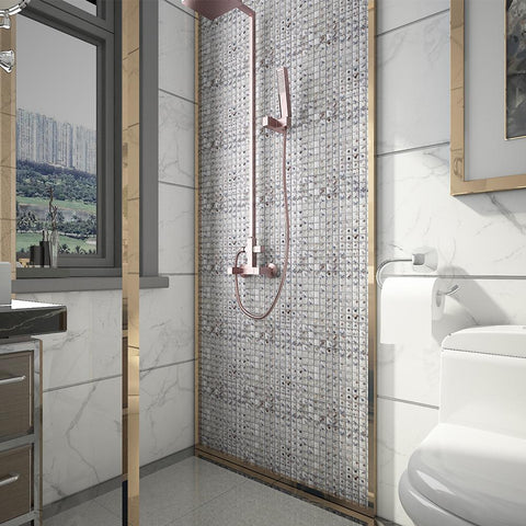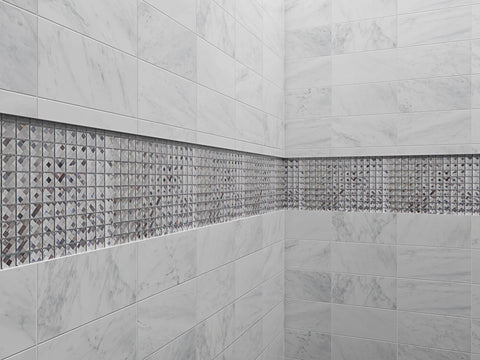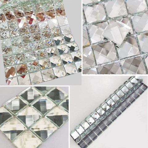 Silver Bling Mirror Glass Mosaic Tile for use as an architectural surface covering. The iridescent appearance and sleek touch lend itself to be mixed and matched perfectly with your bathroom, kitchen.
