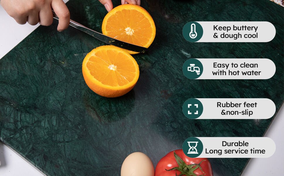 KEEPS DOUGH COOL - Pastry chefs value marble for its natural ability to stay cooler when rolling pastry, cookie and even pizza dough! Refrigerating the dough for 15-30 minutes has best results to keep dough from sticking. Besides, it can also be used for serving cheese, fruits or dessert.